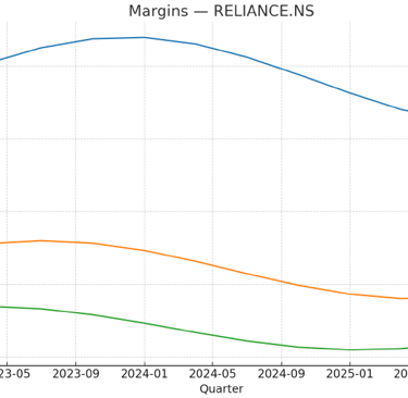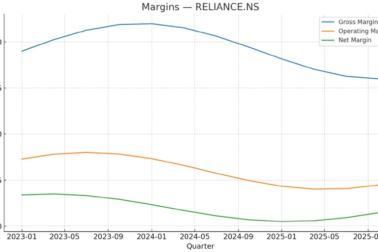 Margins Analysis: The right chart tracks Gross Margin, Operating Margin, and Net Margin across quarterly data from 2023 to 2025. While margins initially rose, they displayed a downward trend from mid-2024, indicating possible cost pressures or declining profitability.