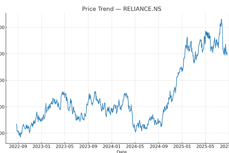 Price Trend Analysis: The left chart illustrates the stock price movements of Reliance Industries over the period from 2022 to 2025, showing phases of volatility with significant upward momentum in early 2025.